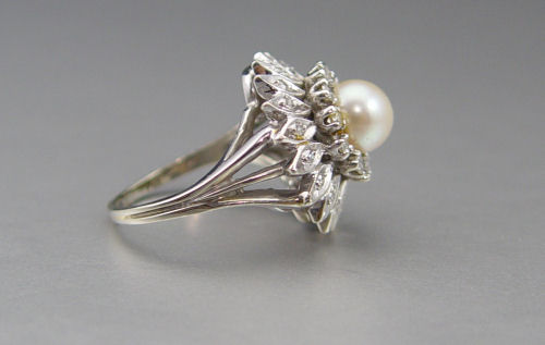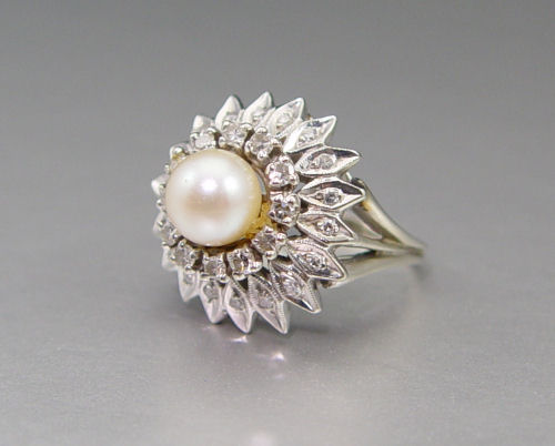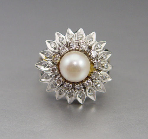 14K PEARL & DIAMOND RING: 14K white gold ring contains thirty round single cut diamonds. WEIGHT: 1.00 Ct. Approx. The diamonds average VS in clarity and H-I in color. The floral or sunburst motif centers one 7.50 mm cultured pearl, cream in color with high luster. The diamonds are prong set. Weight: 8.0 grams. Size: 7