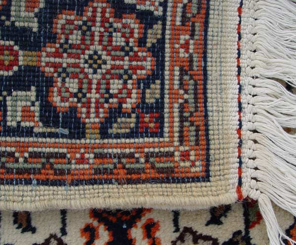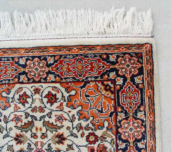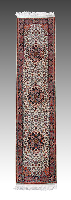 10 FT LONG HAND TIED TABRIZ CARPET RUNNER: Approx. 10' 3''x 2'7''. Romanian Tabriz design Red and blue border, cream ground, center blue medallion. 10' 3'' x 2' 7''.