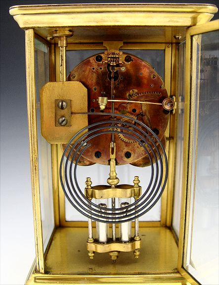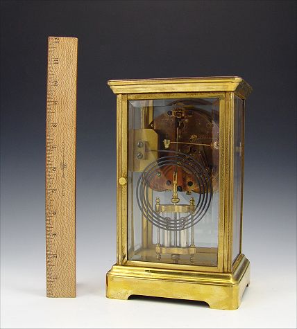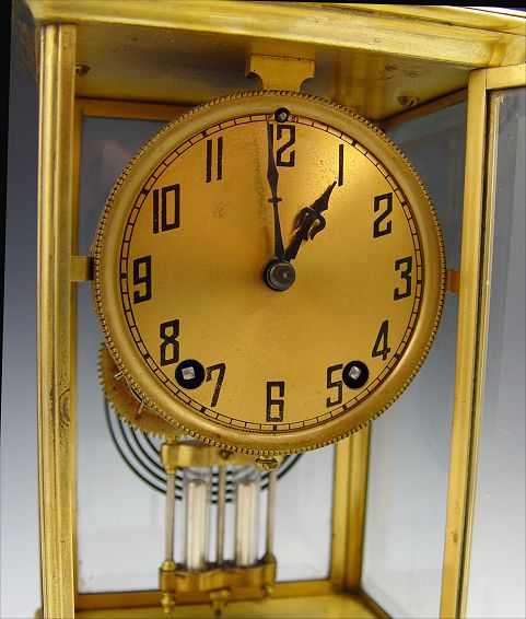FRENCH CRYSTAL REGULATOR CLOCK: Brass case with beveled glass sides (note one side replaced with plastic). Unmarked as to maker. Key and pendulum movement, faux mercury pendulum. Measures 10'' h. x 6 1/4'' x 5''.