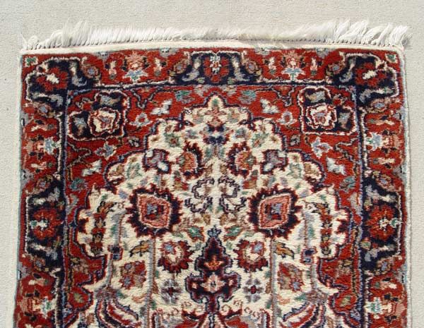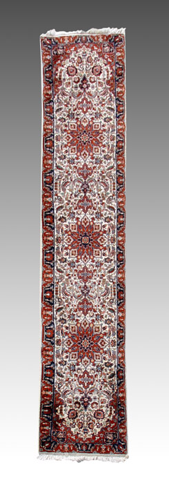 11 FT FINE HAND WOVEN INDIAN CARPET RUNNER: Very intricate design, burgundy with teal and blue, approx. 10' 11'' x 2' 4''