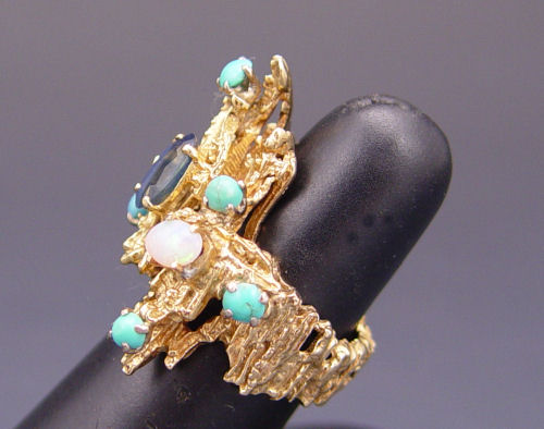 18K SAPPHIRE, OPAL & TURQUOISE RING: 18K yellow gold ring centers one oval shaped mixed cut sapphire, approx. 1.80 Ct. Two oval cabochon cut opals, approx. .50 Ct. and six 3.50 mm cabochon cut pieces of turquoise. All stones are prong set. Weight: 16.1 grams. Size: 6