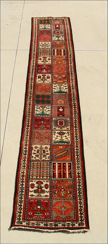 15 FT BAHKTIARIA DESIGN RUNNER: Handwoven in India, approx. 2'6'' x 15'10''.