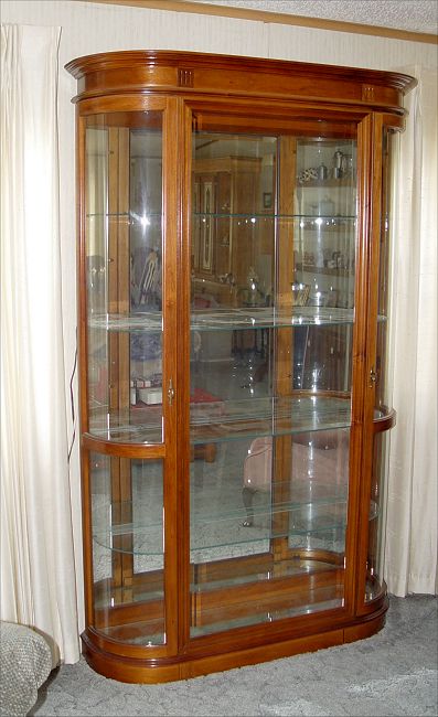 PULASKI STAINED MAHOGANY BOW SIDE DISPLAY CABINET: Mirrored back, interior glass shelves, illuminated. Side opening. Measures 80 1/4'' x 48'' x 13''. For double the pleasure, the previous lot 226 is a match. Please note we request these cabinets remain in place until the end of the auction.