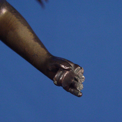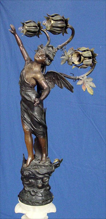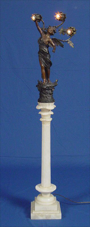 ART NOUVEAU NEWEL POST FIGURAL LAMP ON ALABASTER STAND: Art Nouveau maiden three light lamp, affixed to a 37'' tall carved alabaster pedestal. The ped and lamp are 54'' tall overall, base is 8''square. Minor chips to base, will need bulbs.