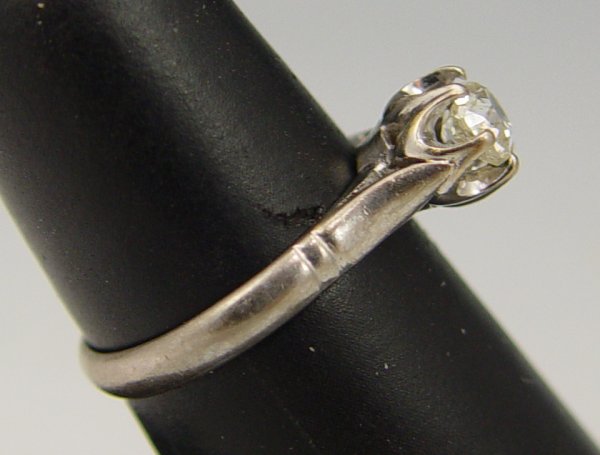 18K OLD MINE CUT DIAMOND SOLITAIRE RING: 18K white gold ring contains one old mine cut diamond. WEIGHT: .38 Ct. Approx. Rated SI1 in clarity and M in color. The diamond is prong set. Weight: 2.9 grams. Size: 6