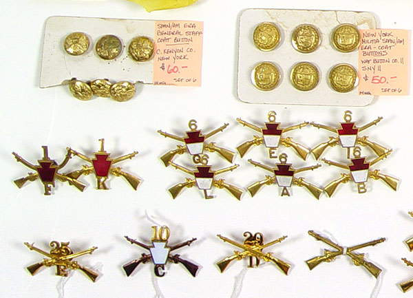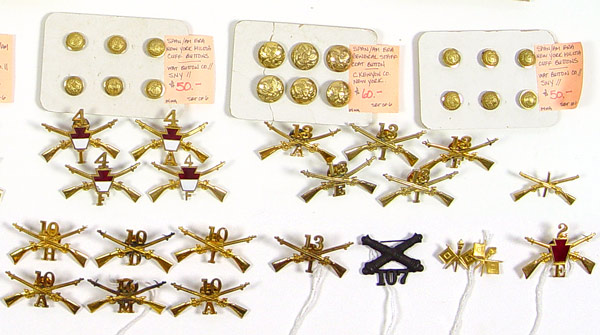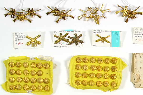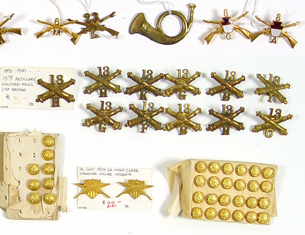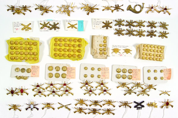 LARGE COLLECTION OF SPANISH AMERICAN WAR AND LATER MILITARY INSIGNIAS: To many to list, some highlights are 24th & 25 black infantry cap badges, many other infantry cap badges, post WWI field clerk collar insignia, Spanish American war era 3rd artillery cap badges. Assorted buttons including General Staff, New York militia, naval button. From a local dealer, all are identified.