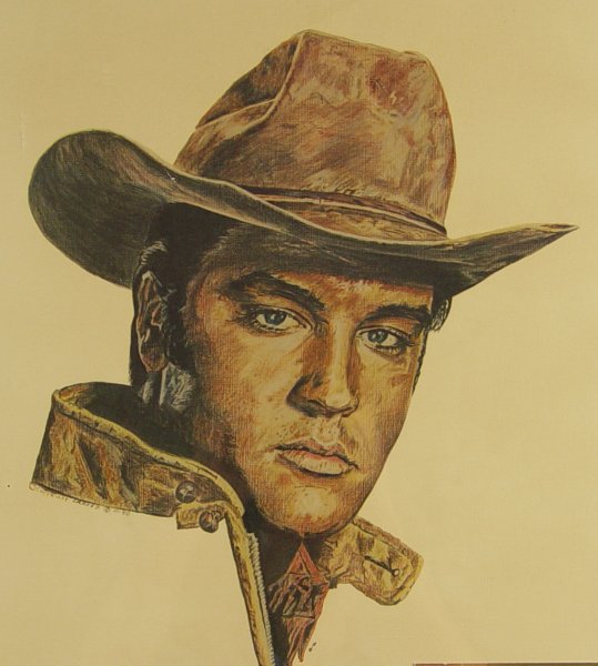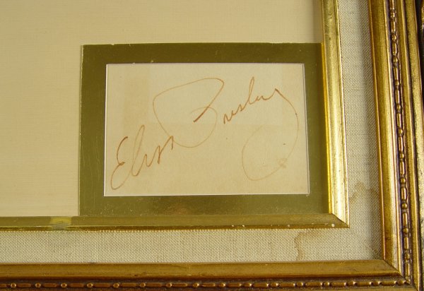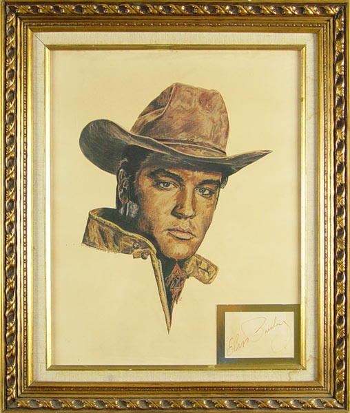 ELVIS PRESLEY AUTOGRAPH & FRAMED PRINT: Clip autograph framed with L. R. Reed print of Elvis. Comes with COA from Jeffery Cain. 25 1/4'' x 21 1/4''