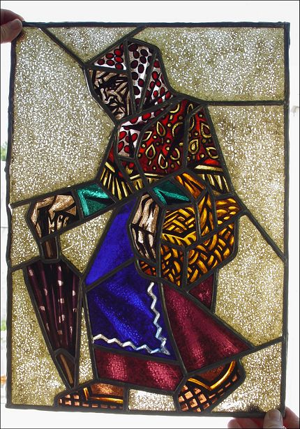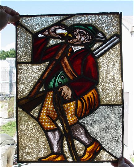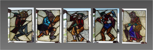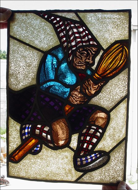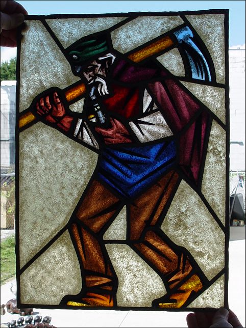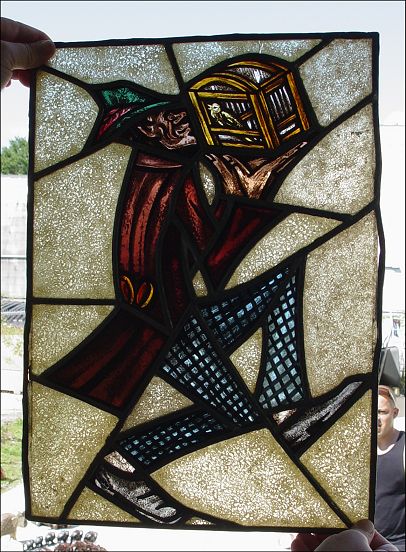SERIES OF 5 OF THE MOST UNUSUAL STAINED GLASS PANELS: Each a whimsical figure in action created out of glass in a great assortment of color and texture. Please note the lead is loose on some panels. Each approx. 18'' x 12 1/2''.