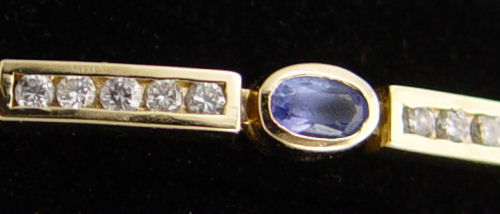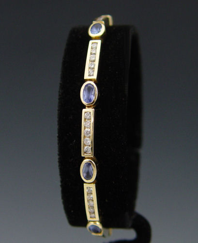 14K TANZANITE & DIAMOND BRACELET: 14K yellow gold bracelet contains fifty round brilliant cut diamonds. WEIGHT: 2.00 Ct. Approx. The diamonds average SI in clarity and H-I in color. Ten oval shaped mixed cut tanzanite. WEIGHT: 2.50 Ct. Approx. Rated VVS in clarity (Type I), bV in Hue, 3 in Tone and 2-3 in Saturation. Weight: 12.4 grams. Length: 7''