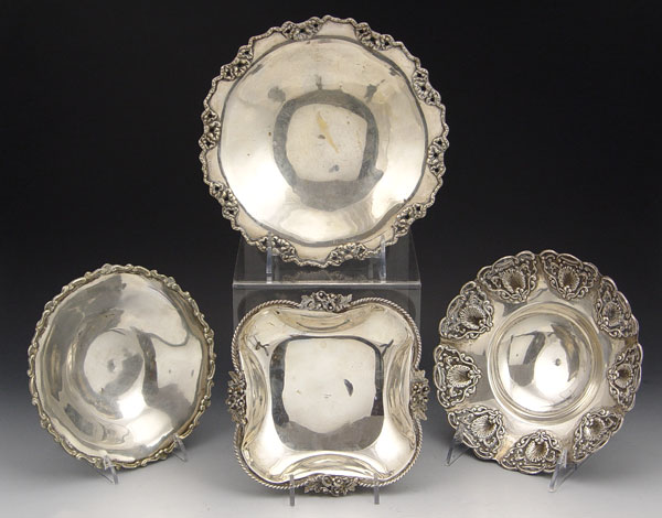 COLLECTION OF 4 FOOTED SILVER TRAYS: To include 1) Sterling candy or nut dish with floral and rope rim. on 4 feet. 1 1/4'' x 6 3/8 square. 2) 800 silver Feyzullzan garland decorated rim on 3 feet. 1 1/4''h x 8 1/4'' dia. 3) 800 silver garland and shell rim on 3 feet.1 1/2'' h x 6 3/4''. 4) Sterling repousse shell design 2 3/8'' h. x 7 1/4''. Approx. 24.8 troy oz.