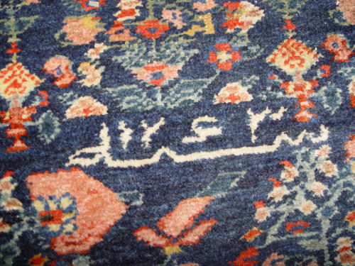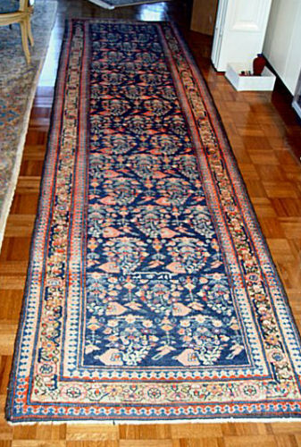 SIGNED HAND TIED FINE HAMADAN CARPET RUNNER: Approx. 12'9'' x 3'3'. Dark blue.