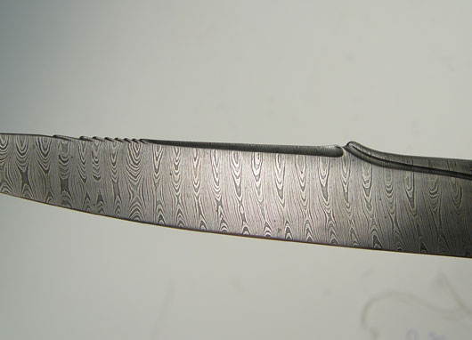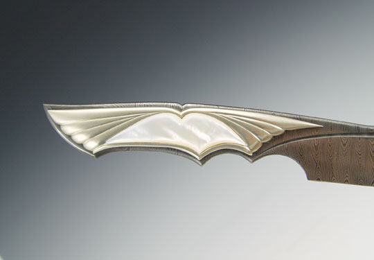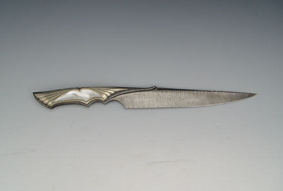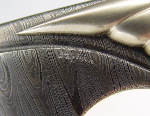 DAN STEPHAN KNIFEMAKERS DAMASCUS FIGHTER KNIFE: Watered Damascus steel 8'' blade with sterling silver and mother of pearl grips. Signed Stephan for Dan Stephan, Knifemakers Guild member. Retails for over $2000. Overall length 13''.