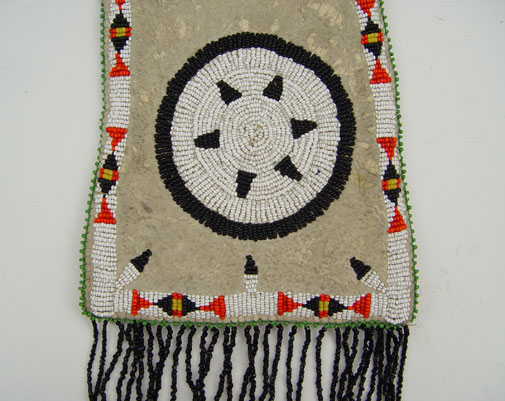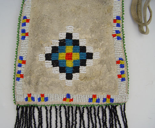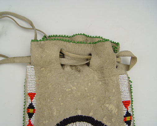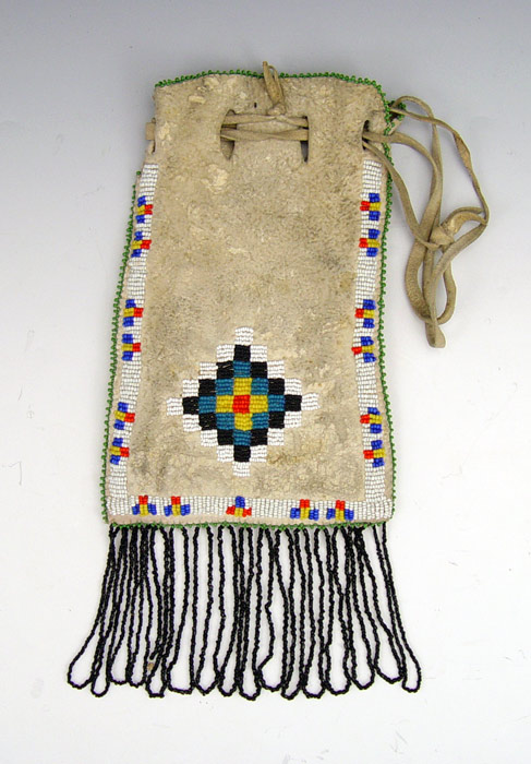 PLAINS INDIAN BEADED PULLSTRING POUCH: Deerskin with each side decorated differently and black beaded bangles. Measures 8 1/2'' x 5 1/2''