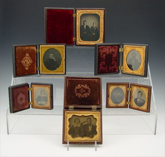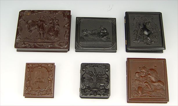 COLLECTION OF 6 TINTYPES & AMBROTYPES IN RARE UNION CASES: To include 1) Ambrotype of a couple in brown ''Sir Roger DeCoverly & the Gypsies'' case. 1'' x 4 7/8'' x 4''. 2) Daguerrotype of young man in black ''The Faithful Hound'' case. 3/4'' x 3 3/4'' x 3 1/4''. 3) Ambrotype of man in black ''Agrarian Scene'' case. 1'' x 3 7/8'' x 3 1/2''. 4) Ambrotype of woman in black ''The Farmers Dream'' case. 7/8'' x 3'' x 2 1/2''. 5) Ambrotype of young couple in brown ''The Calmady Children'' case. 7/8'' x 3 7/8'' x 3 1/2''. 6) Double tintype in brown case with birds in birdbath. 3/4'' x 3'' x 2 1/2''.