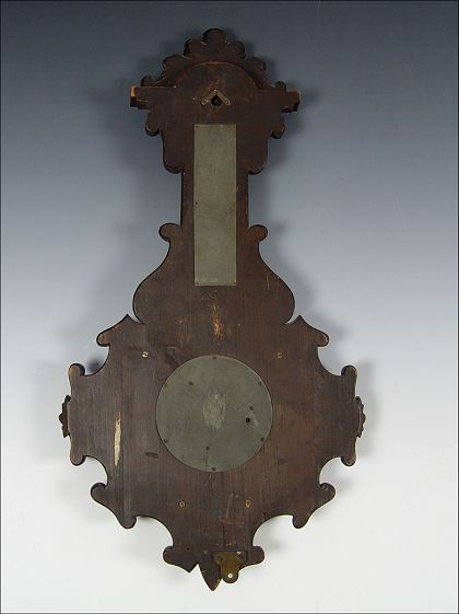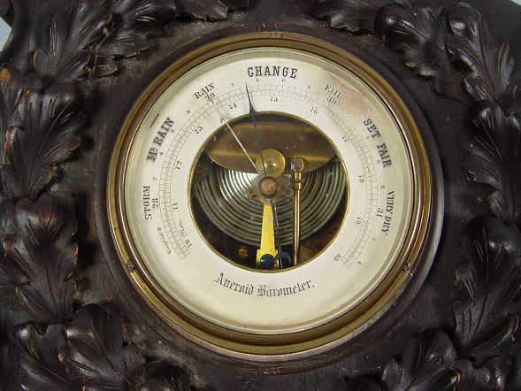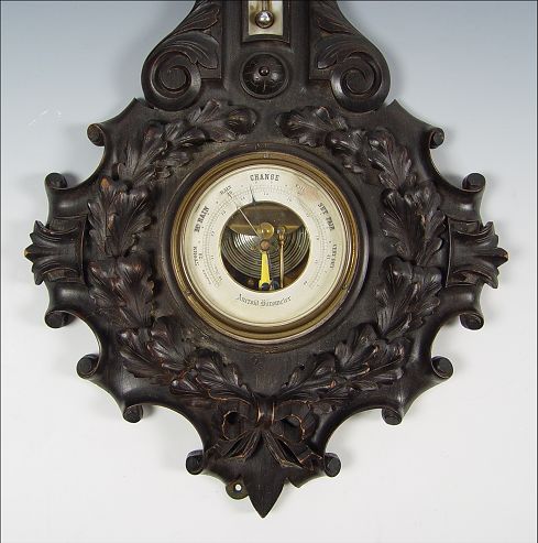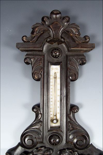 BLACK FOREST CARVED BAROMETER: Aneroid barometer, thermometer with Farenheit & Celcius. Applied carved oak leaves. Measures 29'' h. x 15'' x 2''