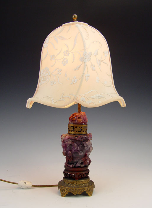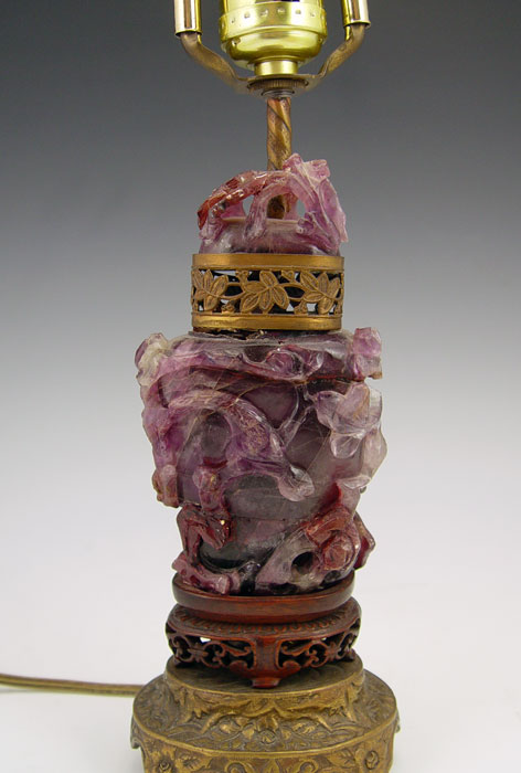 CHINESE CARVED PURPLE QUARTZ LAMP: Covered jar mounted as a lamp. Quartz is 6'' tall, lamp is 17'' tall overall.