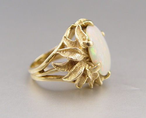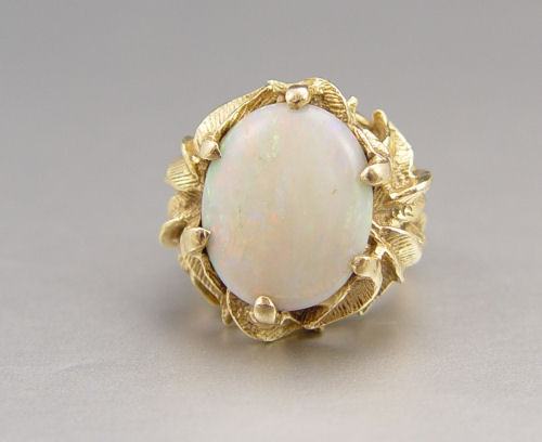 OPAL CABOCHON FOLIATE MOTIF RING: 14K yellow gold foliate motif ring centers an approx. 4.90 Ct. single opal cabochon. Size 7. Weight 13.5 grams.