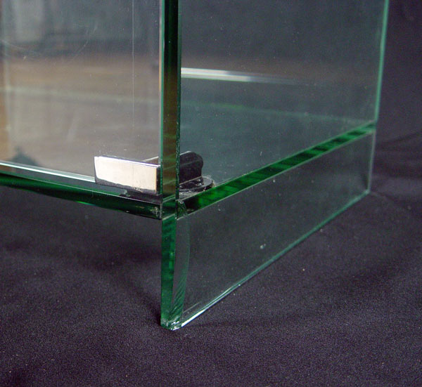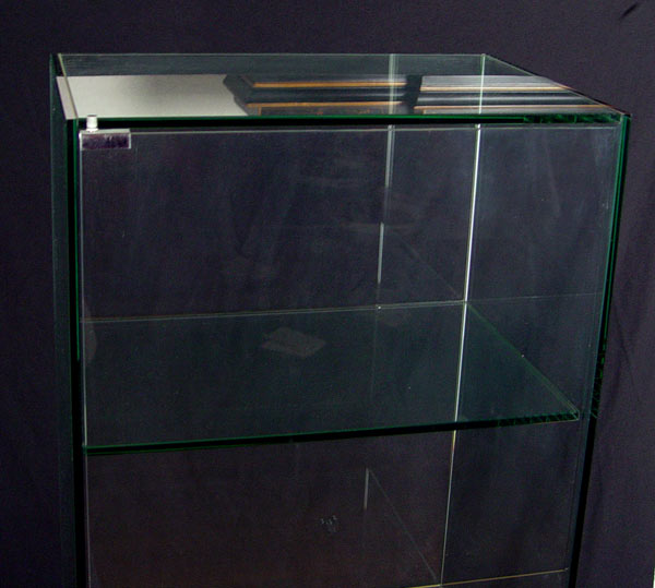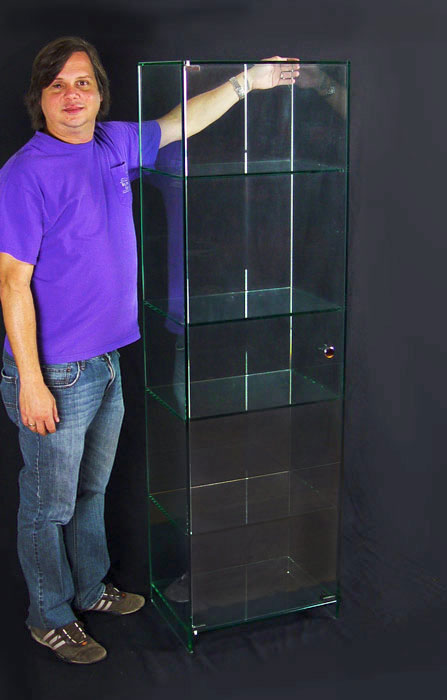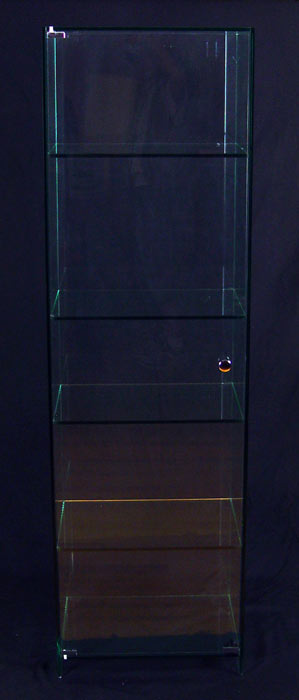 ALL GLASS DISPLAY CABINET: Heavy glass door, sides, top, bottom and 4 shelves. 66 3/4'' h x 19 3/4'' x 14''.