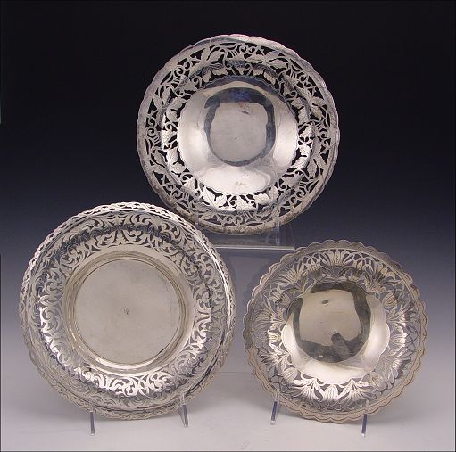 COLLECTION OF 3 OPENWORK CONTINENTAL SILVER TRAYS: To include 1) 800 silver with floral design rim, 3 feet. 7 7/8'' dia. 2) 800 silver scroll design rim with 3 ball feet. 8 1/4'' dia. 3) 800 silver with grape and vine motif rim. 3 feet. Note bend. 9 3/8'' dia. Approx 20.7 troy oz.