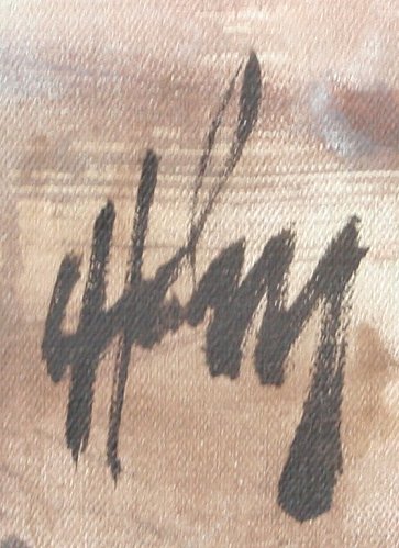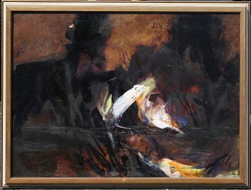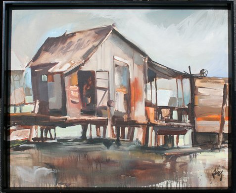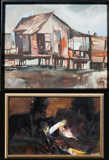 2 FLORIDA ABSTRACT PAINTINGS ILLEGIBLY SIGNED: Egrets in a Landscape, Oil/Canvas, 24'' x 36'', framed, 29'' x 39''; Large Wharf scene, 36'' x 44'', framed, 37'' x 45..