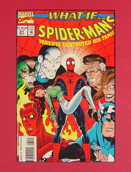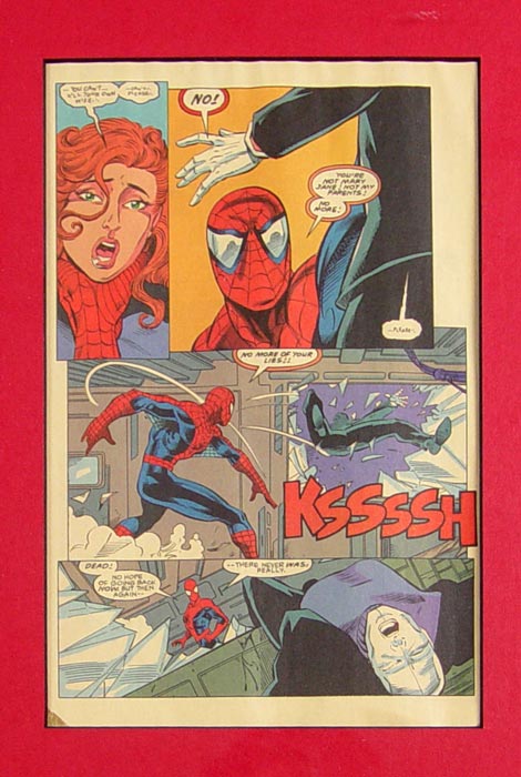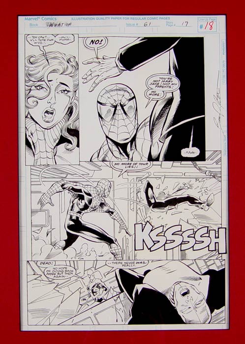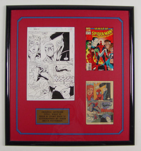 PATTERSON, Bruce, (American, 20th century): Original Marvel Comics cartoon art from the What If series #61 What If Spider-Man's Parents Destroyed His Family? Page 17 features Spiderman and Chameleon disguised as Mary Jane. Framed and matted with comic book cover and example of page out of book. Original art sight size 16 1/2'' x 10 1/2'', framed 32'' x 29 1/2''.