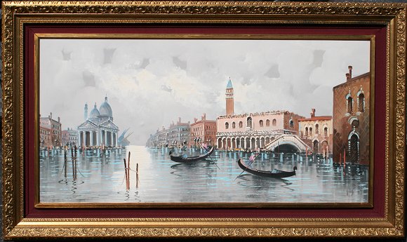 DEVITY STUDIOS VENETIAN CANAL PAINTING: Oil/Canvas, 24'' x 48'', signed, label and stencil verso, framed, 32 1/2'' x 56''.