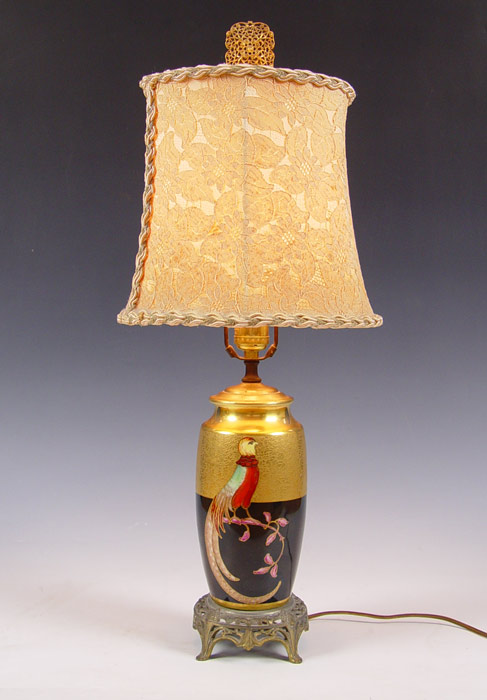 PICKARD PORCELAIN BIRD MOTIF LAMP: Classic textured gold shoulders, full plummage hand painted bird. Porcelain is 8 1/2. The lamp including filigree finial is 23'' tall. Metal base. Sold with the vintage lace shade.
