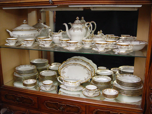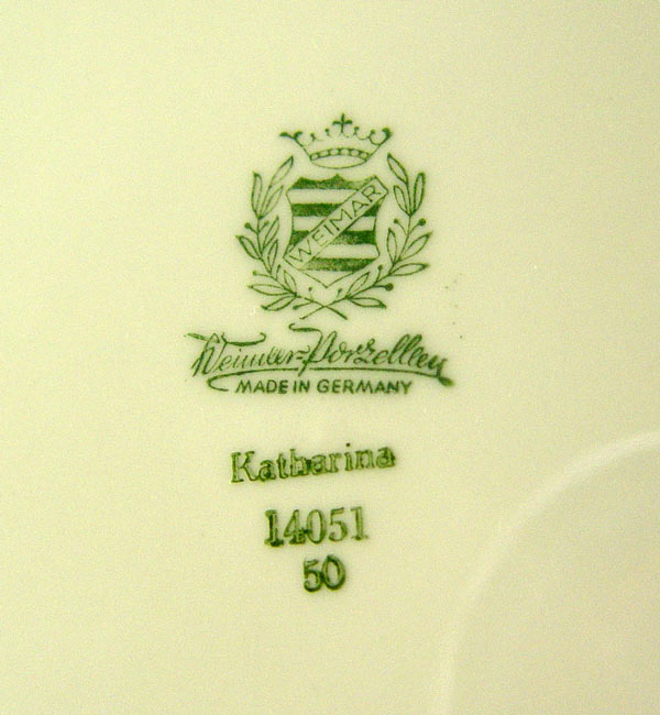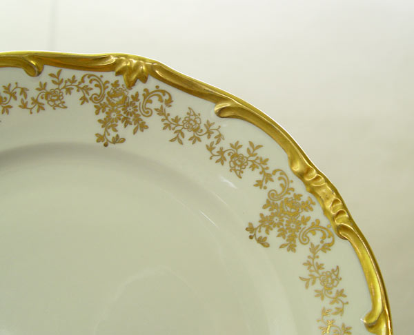 WEIMAR FINE GOLD DECORATED CHINA SERVICE FOR 12: Katharina pattern, 92 pieces to include 12 each of dinner plates, salad plates, soup bowls, bread plates, cups and saucers, and dessert bowls. Serving pieces are the large tureen, coffee pot, cream pitcher, covered sugar, open vegetable, gravy and 2 platters.