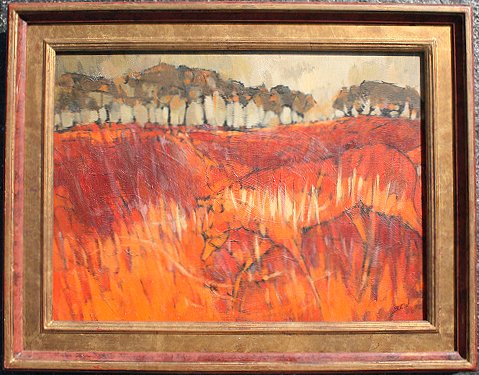 BORINSTEIN, Ruth, (American, 20th C.): Landscape with Coyote, Oil/Canvas, 18'' x 24'', signed, gilded gesso frame, 23'' x 30 1/2''.