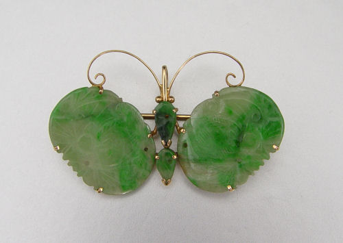 14K JADE BUTTERFLY PENDANT BROOCH: Carved jadeite wings with jade body. 14K yellow gold setting. 1 7/8'' wide.
