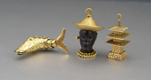 3 GOLD CHARMS: Pagoda, marked K14, 1 1/4'', 4.5 grams; Articulated Fish, marked K14, 1 3/4'', 3 grams; Blackamoor with gold hat, earring and collar, marked *2VA 750, 1 1/4'', 13.5 grams including stone head. Sold as a lot.