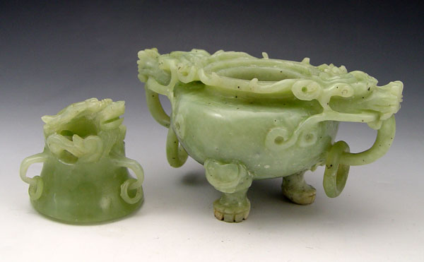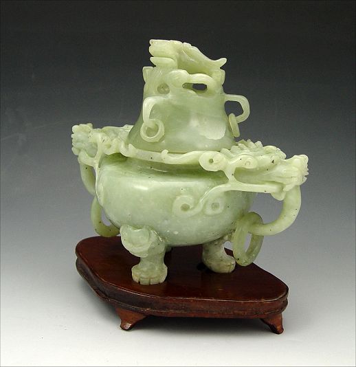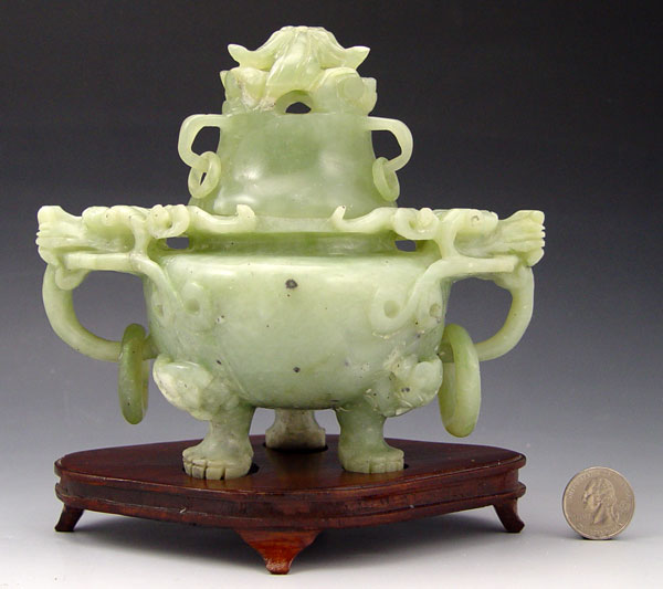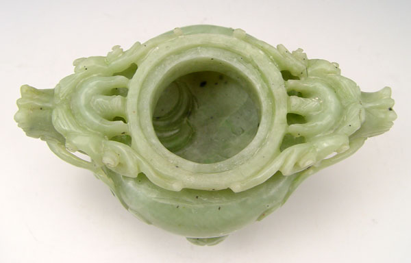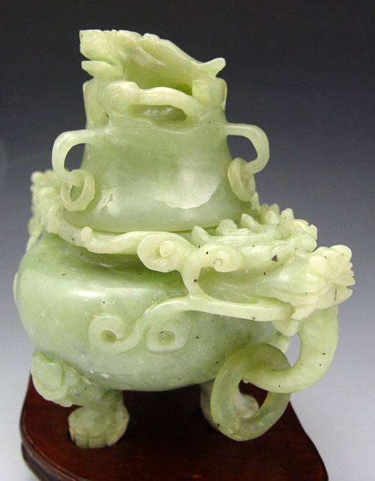 CARVED SERPENTINE CENSOR: 5 1/2'' h x 6 1/2'' x 4''. Sold with wood stand