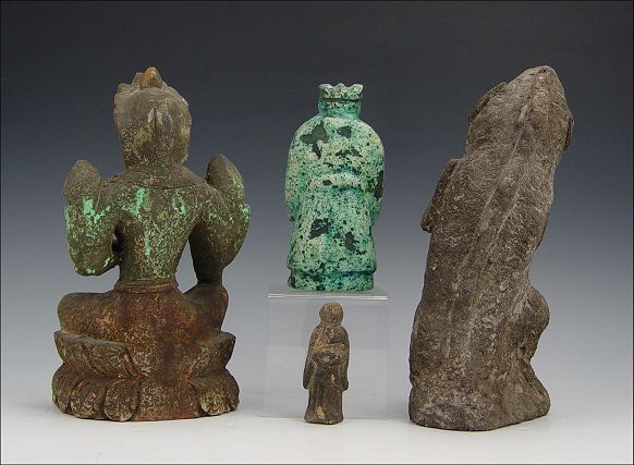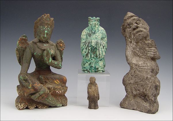 4 PIECE ASIAN DEITIES & FIGURES: To include 1) Polychrome carved wood Hindu deity. Note loss of paint. 8 1/2'' h. x 4 1/2''. 2) Carved volcanic rock figure of deity holding a gourd. 9'' h. x 3 1/2'' x 4''. 3) Carved stone figure in traditional Chinese dress. 5 1/4'' h. x 2 1/2''. 4) Terra Cotta figure of woman with fan and kimono. 2 7/8'' h.