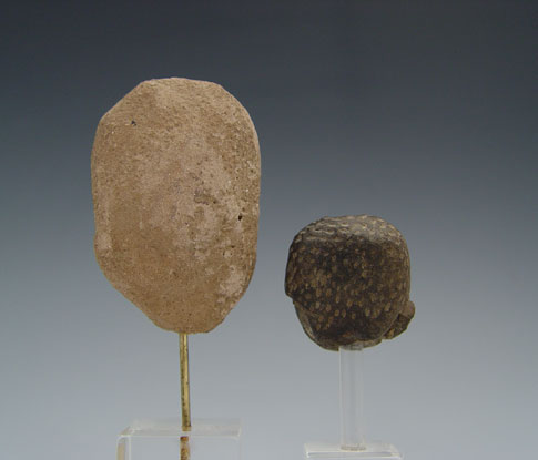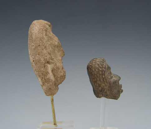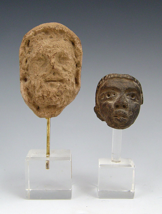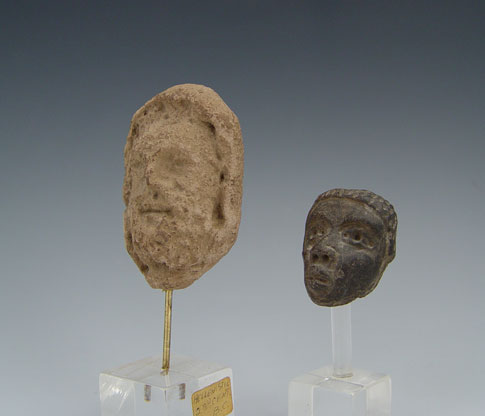 2 PIECE HELLENISTIC POTTERY HEADS: Both on custom stands, to include 1) Bearded male figure head. 2 3/4'' h., 5'' h. overall on stand. 2) African male figure 1 1/2'' h., 3 1/2'' overall on stand.
