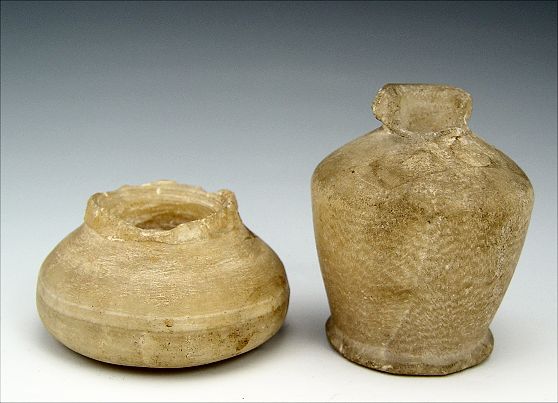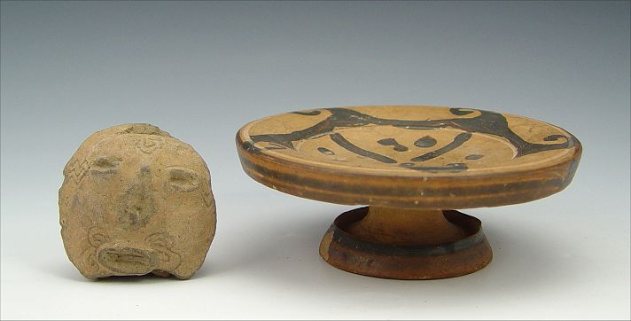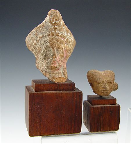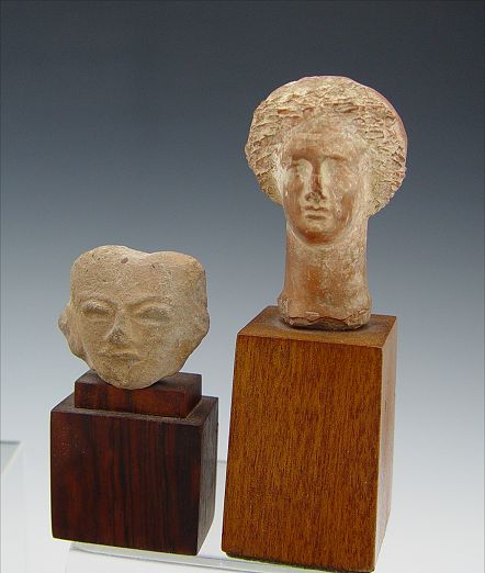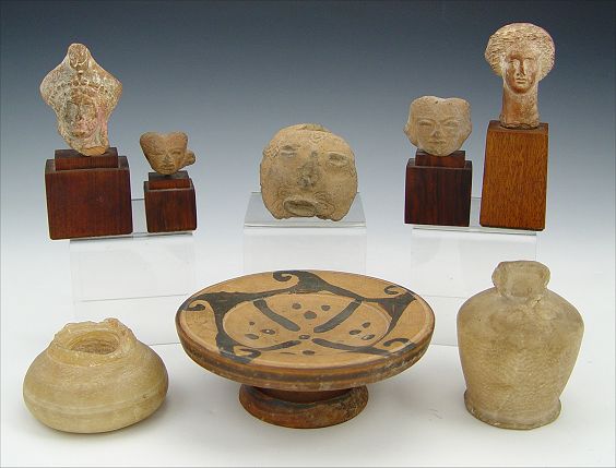 GROUP OF ANTIQUITIES HELLENISTIC HEADS, POTTERY, ETC: To include 2 Hellenistic terra cotta heads on wood stands, largest measuring 5'' high overall; 3 pre Columbian heads (2 on stands), largest measures 3'' h.; pre Columbian terra cotta compote, 2 1/8'' h. x 5'' dia.; 2 carved stone jars, unknown origin, largest 3'' h.
