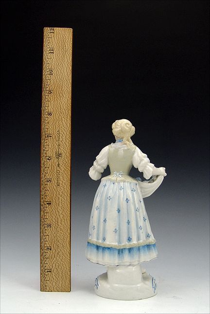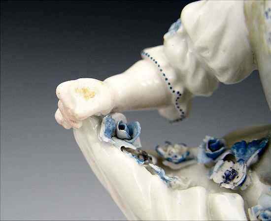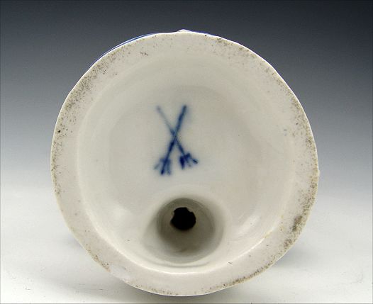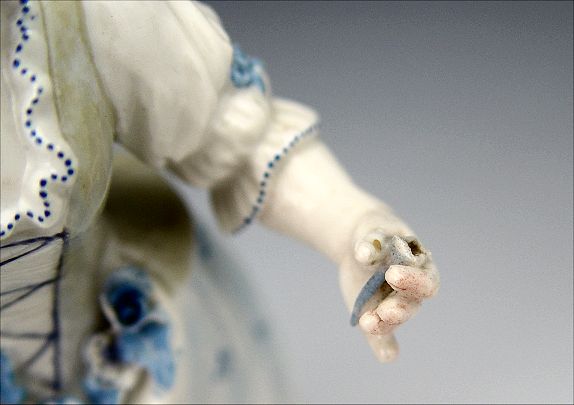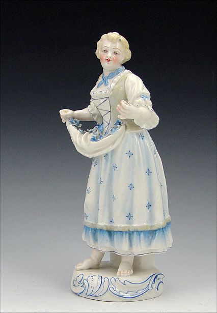 MEISSEN PORCELAIN FIGURE: Flower gatherer, 8''h. Free of cracks, there is loss of flower petal. Blue cross sword mark under glaze.