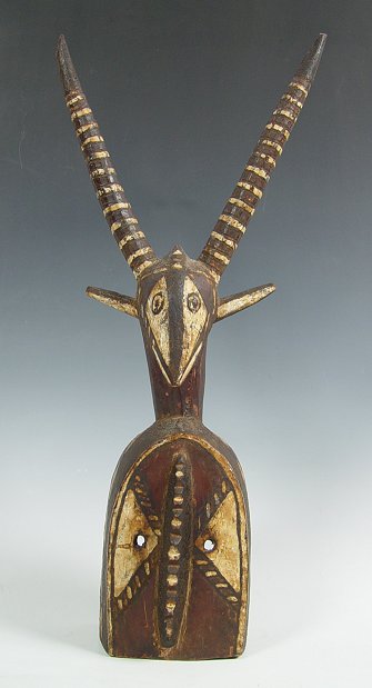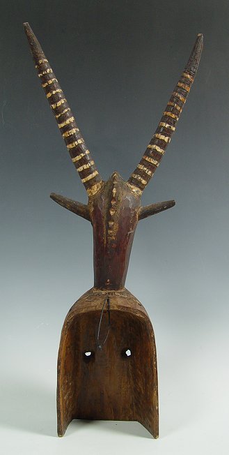 CARVED AND PAINTED WOODEN AFRICAN HORNED ANTELOPE MASK: Bamba, Ivory Coast, 32 1/2''.