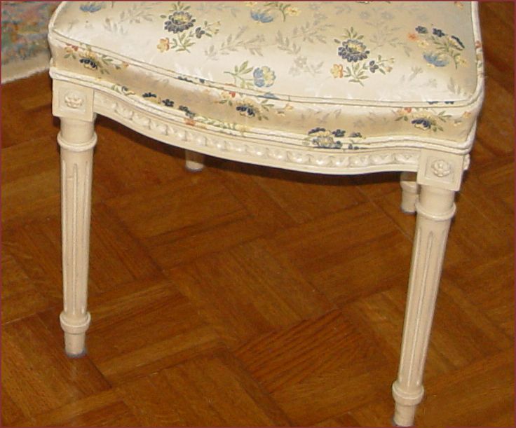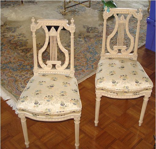 PAIR FRENCH LOUIS XVI STYLE LYRE BACK SIDE CHAIRS: Painted finish, upholstered seat, 36'' x 17'' x 18''.