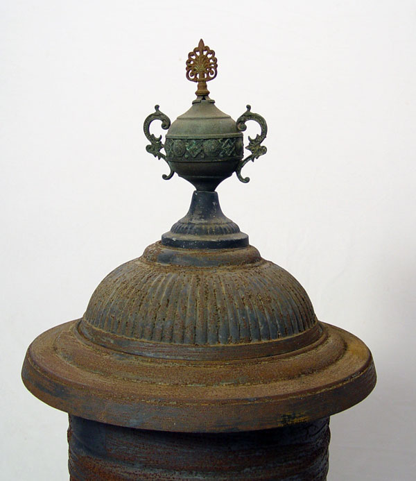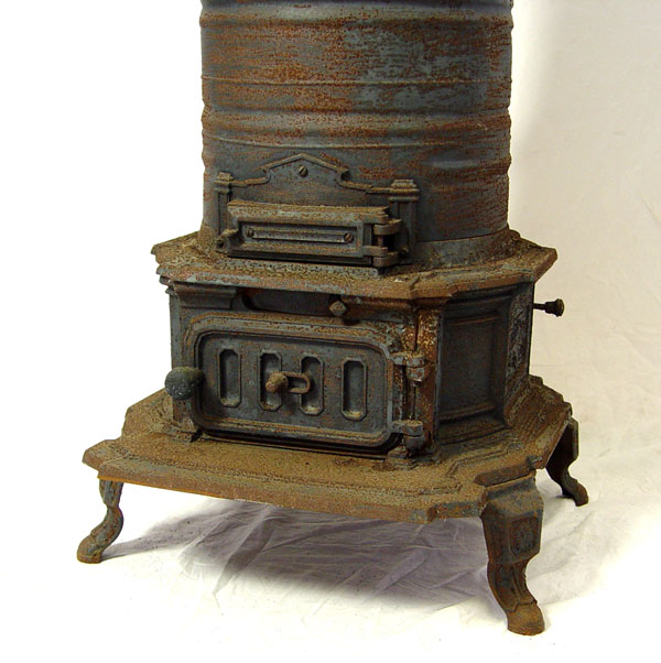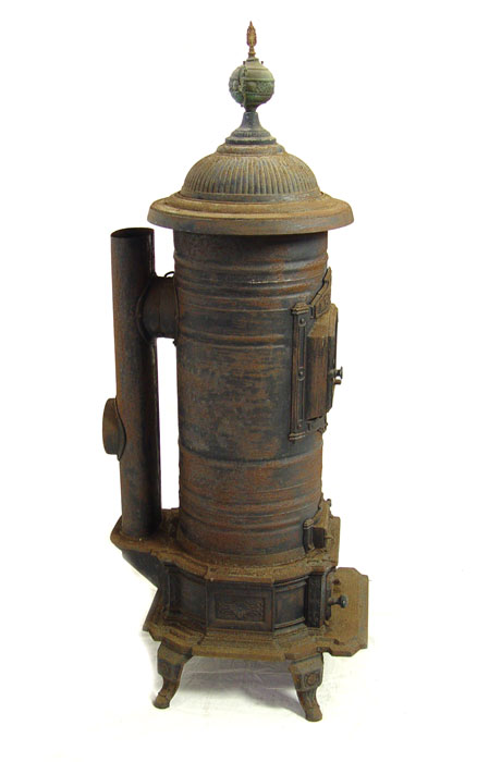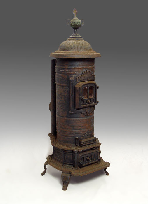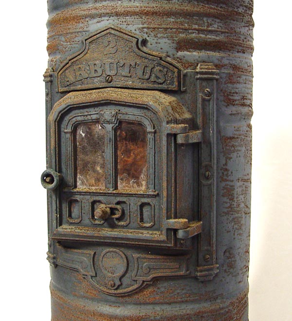 CAST IRON ORNATE ARBUTUS WOOD STOVE: Makers name ARBUTUS above mica window. Urn finial. 55 1/2'' h. x 17 1/2'' x 22''