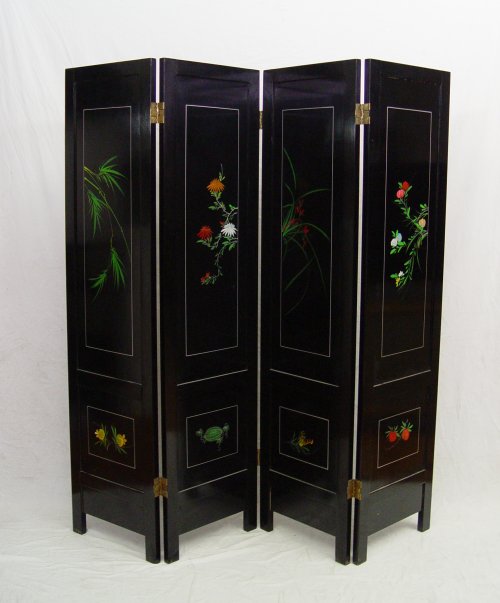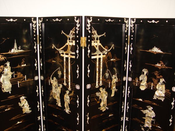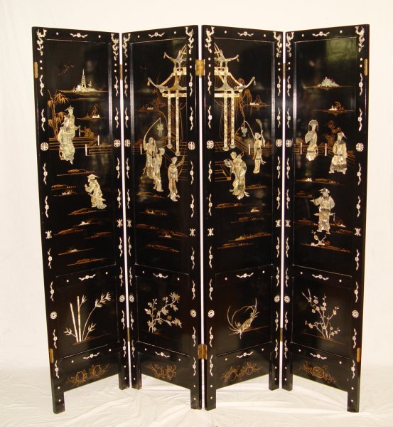CHINESE MOTHER OF PEARL INLAY 4 PANEL SCREEN: Mother of pearl in black lacquer. 71'' h., each panel 17 3/4'' w.