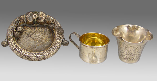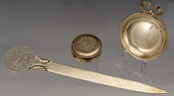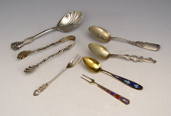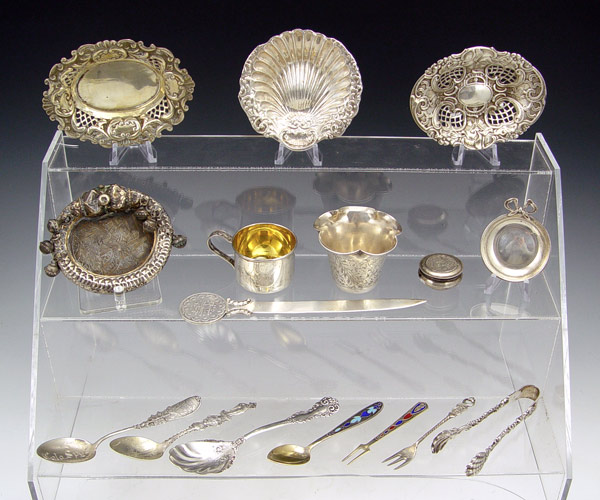 COLLECTION OF SILVER DISHES, SPOONS AND TRINKETS: To include 1) Sterling Cola Springs souvenir spoon. 2) International sugar scoop. 3) 800 silver sugar tongs. 4) Russian enameled demitasse spoon fork. 5) 800 silver Turkish cocktail fork. 6) Sterling Pikes Peak souvenir spoon. 7) 800 silver cup engraved, 2'' h. x 2 5/8'' dia. 8) Turkish 900 silver pill box with coin lid. 9) Lunt sterling child's handled mug, monogrammed1 1/2'' h. 10) Sterling shell form nut dish 3 5/8'' dia. 11) Small nut dish with ribbon, 2 1/4'' dias. 11) 800 silver openwork nut dish 4 5/8'' x 3 1/2''. 12) 800 silver openwork nut dish 3 3/8'' x 2 1/4''. 13) 800 silver Turkish letter opener with coin pommel. 7 3/8''. 14) Turkish silver? dish with bells, metal content unknown. Approx 14.1 troy oz.