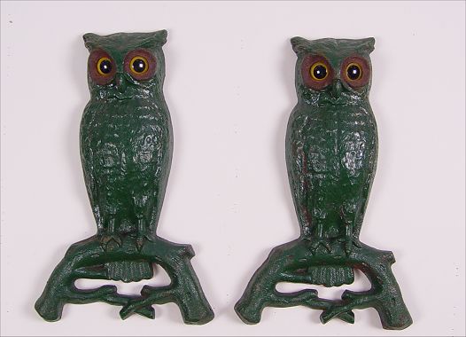 PAIR 1887 OWL ANDIRONS WITH GLASS EYES: Cast iron, painted green with inside plaque reading ''Copyright Sept 14. 1887''. 15'' h. x 9 1/2''. Note: No dogs.