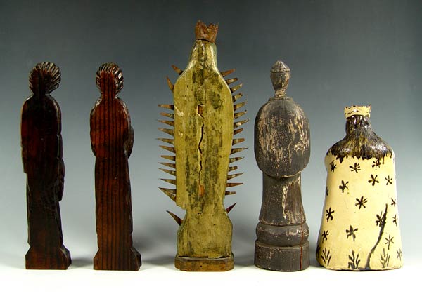 COLLECTION OF 5 RELIGIOUS SANTOS FIGURES: 1) Hand painted clay figure with crown, 11 1/4''h., (chips on crown). 2) Polychrome wood figure, metal crown and flames, 17''h. 3) Wood figure, paint remnants, 24 1/2''h. 4-5) flat back carved mahogany apostles. 14''h.