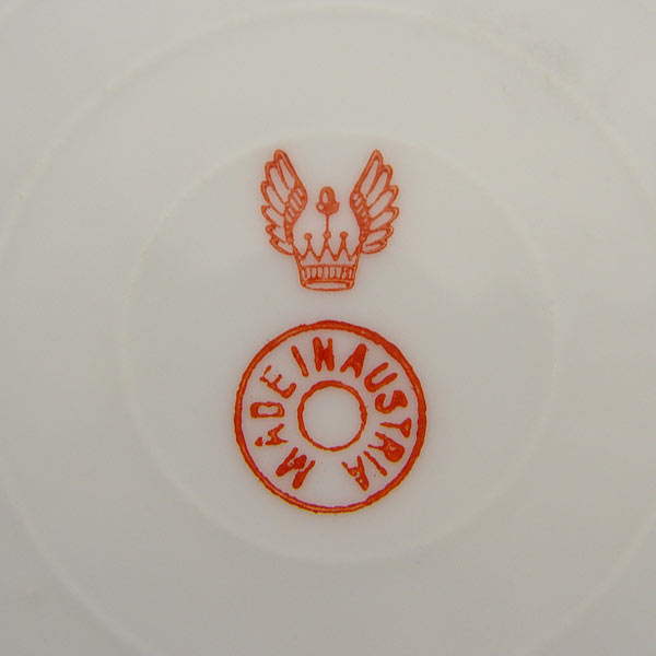 HAND PAINTED AUSTRIAN PORCELAIN COFFEE AND DESSERT SET: Rich iron red and gold. Made in Austria, unidentified red wing mark over glaze. Includes 8 demi-tasse cups and saucers, and 8 plates. Please note hairline in 1 cup and 1 plate.