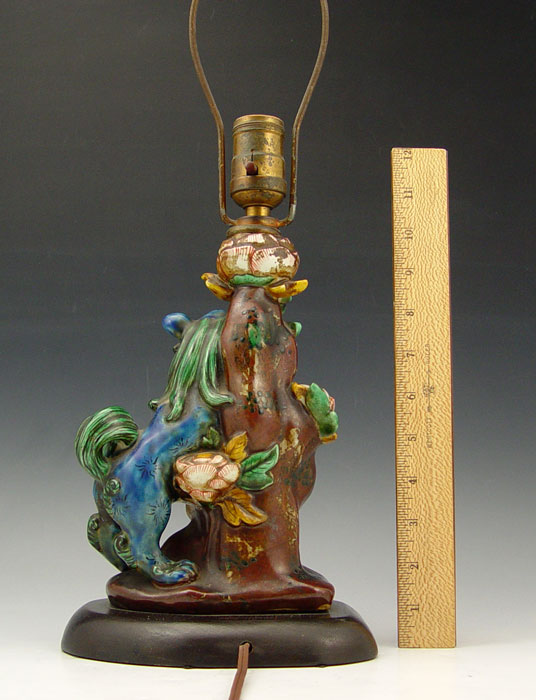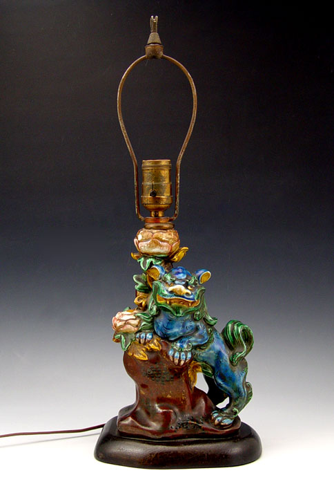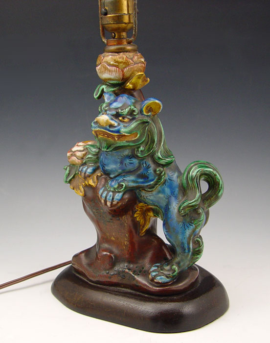 POLYCHROME CHINESE CERAMIC FOO DOG LAMP: Turn of the century, mounted on a wood base. Ceramic is 9'', the lamp is 17'' tall overall.