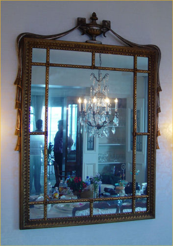 LARGE SILVER GILT MIRROR: Carved wood drape and urn design, approx. 49'' x 34''. Please note small chip where the urn meets the drape.
