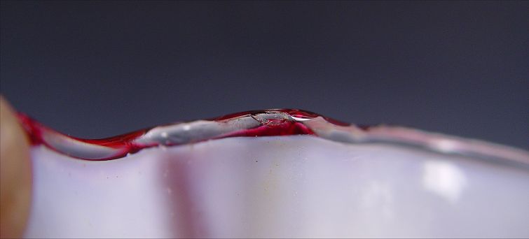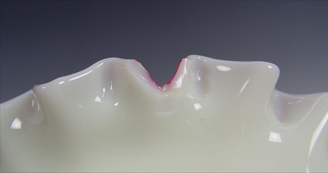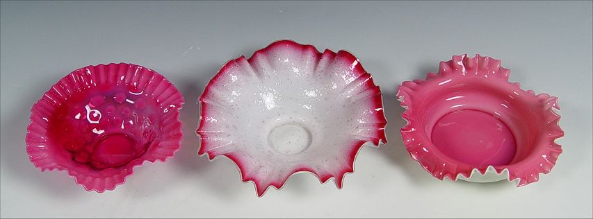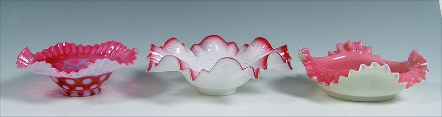 3 CRANBERRY GLASS BRIDE'S BASKET BOWLS: 1) Mica fleck opaque white glass bowl with cranberry border, 10 1/2'' dia. 2) Cranberry cased bowl, 10' dia. (chip on underside of one ruffle). 3) Opalescent coin spot bowl, 9 1/2'' dia.