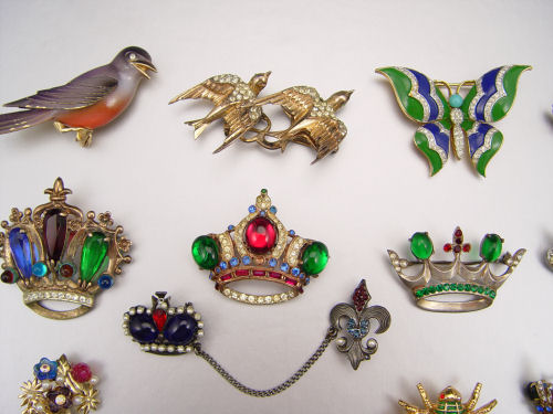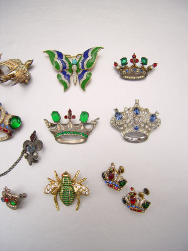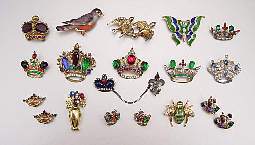 SIGNED VINTAGE CROWN, BUG, AND BIRD FIGURAL PINS: To include Sterling Coro Craft bird Duet, Sterling Coro Craft crown, Weiss, Trifari, Roman and Carol Lee. 12 pins, 2 pairs of earrings, and a pair of fur clips.