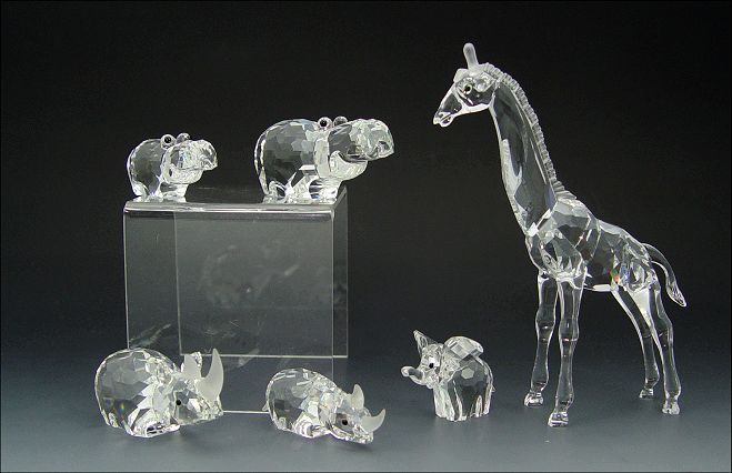 6 PIECE SWAROVSKI CRYSTAL ''AFRICAN WILDLIFE'': 1988 Large Rhinoceros, retired 1992, 2 7/8''; 1988 Large Hippopotamus, retired 1992, 2 5/8''; 1989 Small Elephant, 1 1/4''; 1989 Small Hippopotamus, retired 1995, 2 1/4''; 1990 Small Rhinoceros, retired 1995, 2 3/8''; 1999 Small Giraffe, retired 2005, 5 1/8''. All have boxes.