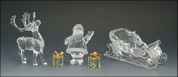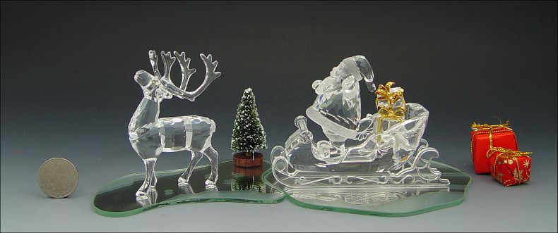 SWAROVSKI CRYSTAL SANTA & SLEIGH: ''Exquisite Accents'' 1996 Sleigh, with packages and small tree; 1998 Santa, 2 3/8''; 1997 Reindeer, 3 1/4''. And two piece frosted mirrors. All have boxes.